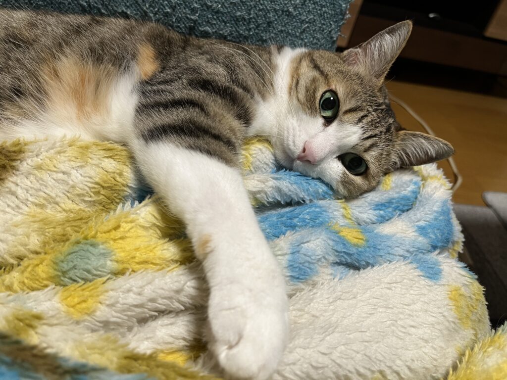大好きな毛布を抱えたふく。
